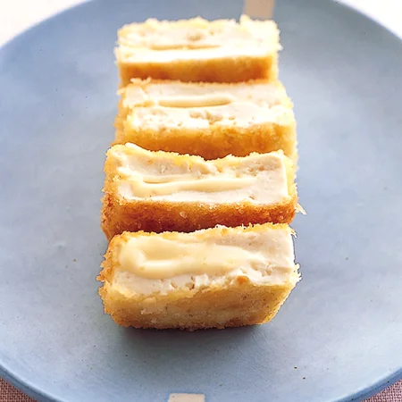 豆腐の厚みを半分にするように切り目を入れ、チーズを2切れずつはさむ。小麦粉を薄くまぶし、卵、パン粉の順にころもをつける。