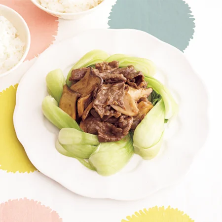 チンゲン菜2株は四〜六つ割りにし、耐熱ボウルに入れる。水1/4カップ、サラダ油小さじ1/2、塩少々をふり、ふんわりとラップをかけ電子レンジで約3分加熱する。粗熱をとって水けを絞り、器に並べる。「中華風牛しぐれ煮」半量(約300g)を中央に盛る。