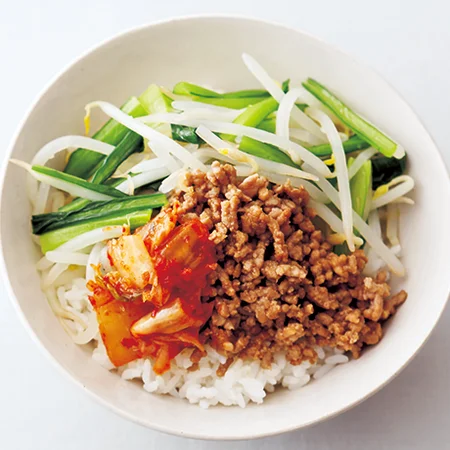 どんぶりにご飯を盛り、1と2、キムチをのせる。