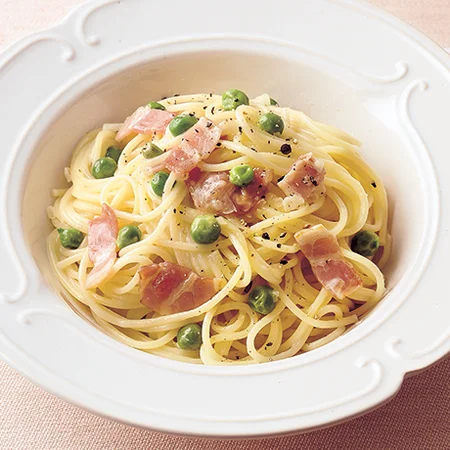 スパゲッティのゆで上がり3分前になったら、グリーンピースを加えて一緒にゆでる。ゆで汁1/2カップをとりおき、ざるにあけて湯をきる。