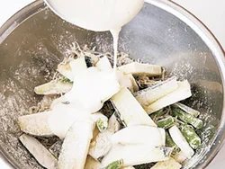 たねに小麦粉を薄くまぶしてからころもをからめると、たねがまとまりやすくなり、なすのうまみも逃げない。