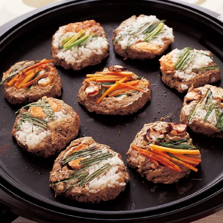ホットプレートに油少々を熱し、1を直径7〜8cmに広げて焼く。上にたこ、万能ねぎ、にんじん、たらこ、ご飯を少しずつのせる。下の面が固まったら上下を返し、焼き色がついたら再び上下を返す。同様にして何回かに分けて焼く。しょうゆと酢を同量混ぜた酢じょうゆを添えても。