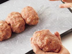 肉だねを4等分して丸め、両手でキャッチボールをするようにして空気を抜き、天板に4つを1列にくっつけて並べ、高さ5〜6cm、長さ約30cmに整える。