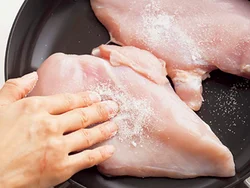 とり肉をフライパンに広げ、塩大さじ1をすり込み、こしょう少々をふる。