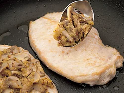 炒めたマッシュルームとマスタードの風味が味の決め手に。むね肉にのせて焼くので、肉をしっとりさせる効果もある。