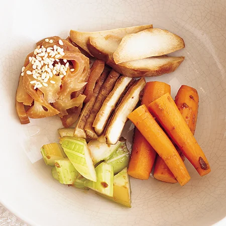 里いもやれんこんは下ゆでせずに縦半分に切って、みそ床に漬ける。漬かったものは薄切りにして、酢水で洗って水けをきり、ほんのり酢をきかせてもおいしい。
