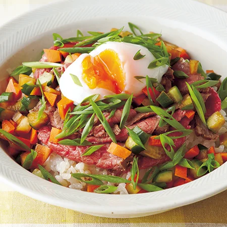 器にご飯を盛り、1の牛肉をのせる。ねぎ以外の野菜を散らし、つけだれ適量をかける。中央に温泉卵をのせ、ねぎを散らす。