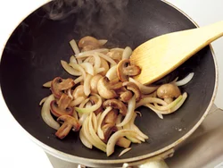 マッシュルームにしっかり焼き色がつき、玉ねぎがうすく色づくまで炒め、素材の甘みを引き出す。
