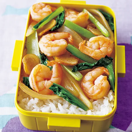 フライパンに油小さじ1を熱し、下準備した材料を汁ごと入れて炒める。えびの色が変わったら、小松菜を加え、さっと炒め合わせる。