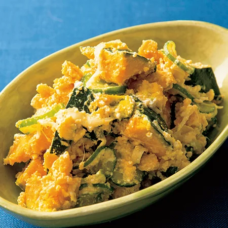 かぼちゃは3cm角に切る。大きめの耐熱容器に入れ、ふんわりとラップをかけて電子レンジで約3分加熱する。取り出して上下を返し、再びふんわりとラップをかけて、電子レンジで約3分加熱する。取り出して、木べらで粗く潰し、粗熱をとる。