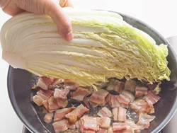 白菜は芯がついたまま縦半分に切る。ベーコンは1.5cm四方に切る。