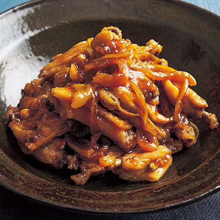 厚手の鍋に手羽中、下準備したゆずを汁ごと、にんにく、しょうゆ大さじ3、水大さじ2を入れてふたをし、強火にかける。