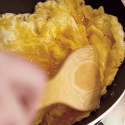 卵の縁が固まり始めたら、木べらを大きく動かし、半熟の部分をゆっくりと混ぜる。