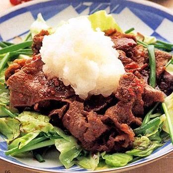 同じフライパンを強火にかけ、牛肉の両面を焼き、豆板醤、焼き肉のたれを鍋肌から加えて、肉にからめる。2に肉を盛り、軽く水をきった大根おろしをたっぷりとのせる。