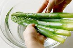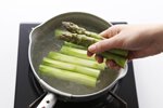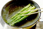 ほうれん草などと違って、あまりアクのないアスパラガスは、ゆでるときにたっぷりの湯は必要ありません。長いままゆでたい場合、フライパンでゆでると便利です。