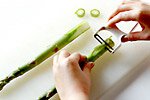 炒めものなどの場合は、まず根元を1cmくらい落とし、根元から3〜4cmの皮を、皮むき器でむきます。節ごとに「はかま」と呼ばれる三角形の包葉がついていますが、新しいものはかたくないので、そのまま調理して大丈夫。口当たりが気になるようなら、大きいものだけ皮むき器で取っても。