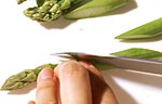アスパラをそろえて、端から3cm長さに切ります。このままサッとゆでてサラダに。ゆでてから切ってもOK。