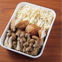 えのきたけは、長さを3等分に切ってほぐす。しいたけは軸ごと四つ切りにする。しめじはほぐす。