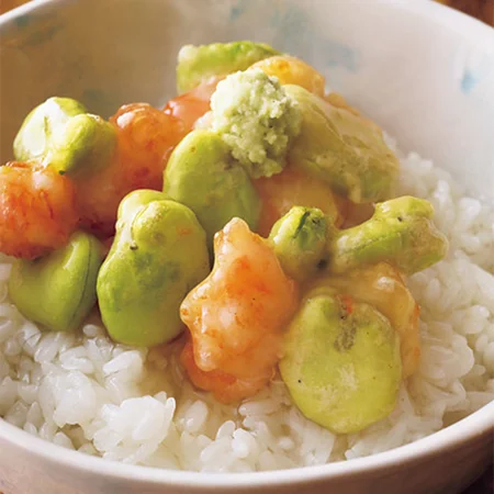 どんぶりに温かいご飯小どんぶり1杯分ずつを盛り、「そら豆とえびのビールごろもかき揚げ」を2~3 個ずつのせる。1を等分にかけ、練りわさび適量をのせる。