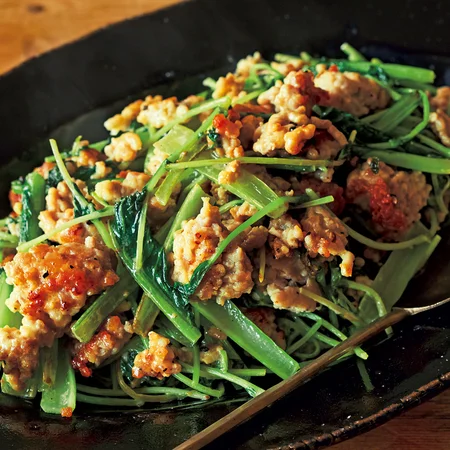 小松菜は5cm長さに切り、豆苗は長さを半分に切る。