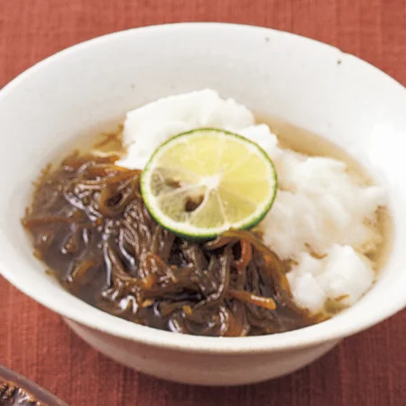 もずくは水でよく洗い、ざるにあけて水けをよくきる。
