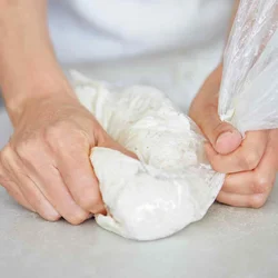 生地がなめらかになり、ひとまとまりになったら、袋の中で生地をコッペパン状に整え、生地が乾燥しないよう袋の口を閉じて、室温で約30分おく。