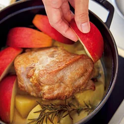 皮ごとポットローストするりんごのほのかな甘みと酸味が、ジューシーな豚肉と相性抜群。つけ合わせも同時仕上げで時間短縮!
