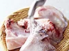 あらは盆ざるにのせ、熱湯を回しかける。あらは皮がはがれる心配をしなくていいので、ペーパータオルをかぶせなくてもいい。長ねぎは青い部分と白い部分とに分け、白い部分は4cm長さに切って縦半分に切る。
