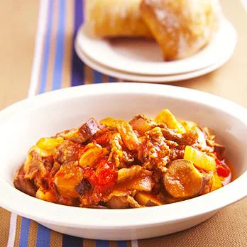 厚手の鍋にオリーブ油大さじ2とにんにくを入れて火にかけ、香りが立ったら1の玉ねぎを加えて炒める。玉ねぎが透き通ったら、なすも加え、しんなりするまで炒める。