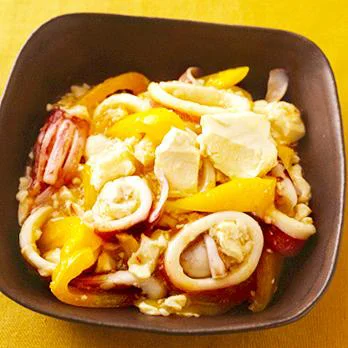 フライパンにサラダ油大さじ1を熱し、にんにく、しょうが、豆板醤、カラーピーマンの順に加えてそのつど炒める。カラーピーマンがしんなりしたら、2のいかを加えて強火にし、合わせ調味料を加える。2の豆腐を入れて大きくくずし、ひと煮立ちしたら、水溶き片栗粉でとろみをつけ、ごま油少々を回し入れる。
