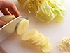 にんにくはみじん切り、キャベツは芯を除いて5cm角の色紙切り、じゃがいもは皮をむいて5mm厚さの薄切りにする。スパゲッティは塩を加えた熱湯でゆで始める。