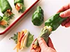青じそに大根とにんじんと赤とうがらしをそれぞれ等分にのせて巻き、ピーマンの中に詰める。