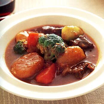 デミグラスソース缶、みそ大さじ2〜3、スープの素、かぶを加えて30分〜1時間煮る。火を止めてブロッコリーを入れ、さっと混ぜて器に盛る。