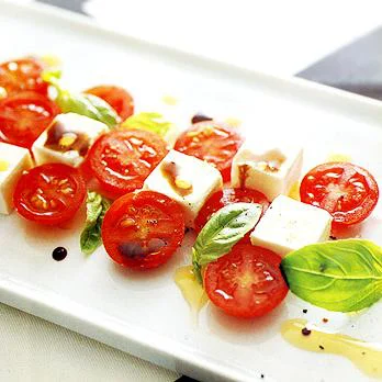 ミニトマトとクリームチーズを器に盛り、バジルを飾ってオリーブ油大さじ3/4、あればバルサミコ酢をふり、全体に塩、こしょう各少々をふる。