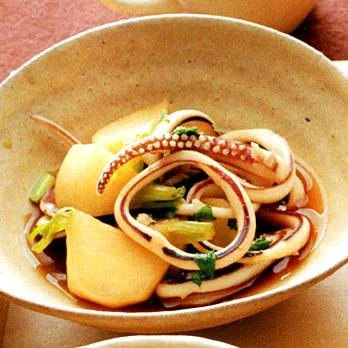 いかは足を胴から引き抜き、胴と足に分け、内臓を取り除く。胴は洗って細い輪切りにし、足は食べやすい大きさに切る。かぶは六つ割りにし、かぶの葉は3cm長さに切る。