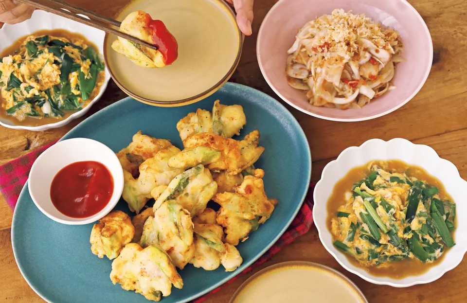 新玉ねぎに熱湯をかけ、さましながら梅干しをほぐして調味。メインを揚げ焼きにし、卵とじを作り、梅あえを仕上げます。