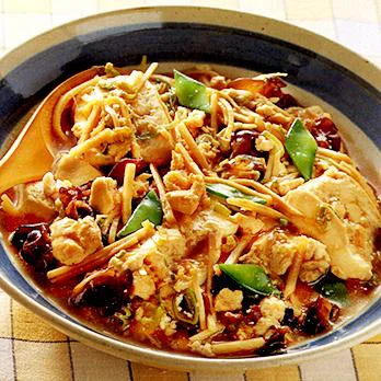 - 3 ざっと炒めたら合わせ調味料、豆腐、絹さやを加え、中火で煮る。煮立ってから1〜2分煮て、水溶き片栗粉を加えてとろみをつける。仕上げにごま油を回しかけ、器に盛る。