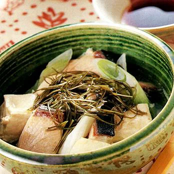 - 2 どんぶりにぶり、豆腐、ねぎを並べ、昆布をのせる。昆布のもどし汁大さじ4と酒小さじ1をふりかけ、ラップをかけて電子レンジで約3分加熱する。