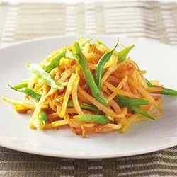 - 3 豆腐を3〜4cm角に切って片栗粉適宜をまぶす。中温(約170℃)の揚げ油で、揚げ色がついて、表面がカリッとするまで揚げる。ししとうを素揚げにし、高温(約180℃)にしてなすも素揚げにする。