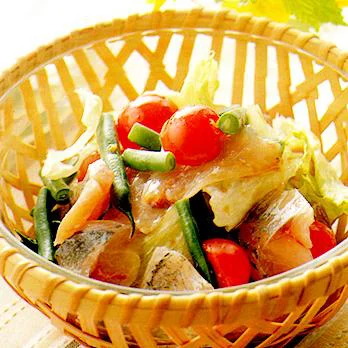 - 3 1のあじの皮を頭のほうから身に平行に引くようにしてむき、そぎ切りにする。2の野菜とあじをさっくりと混ぜ合わせて器に盛り、食べる直前にドレッシングを混ぜてかける。