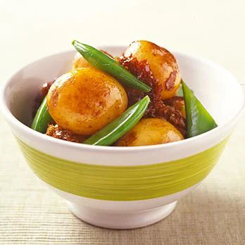 - 3 煮立ったらアクを除き、5分煮て、砂糖大さじ1、塩小さじ1/3を加えてさらに10分煮る。次にしょうゆ、みりん各大さじ1を加えて煮汁がほとんどなくなるまで10分ほど煮てから火を止める。1のスナップえんどうを加えて、さっと混ぜる。