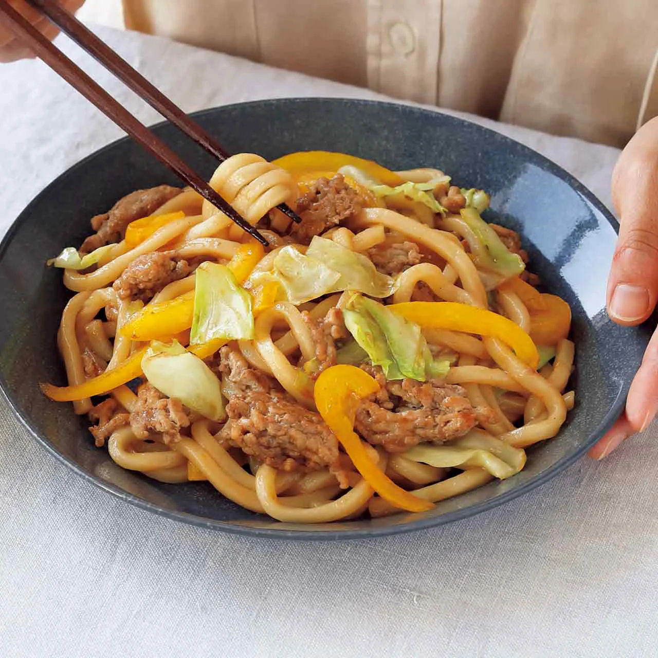 豚肉にらたま焼きうどん