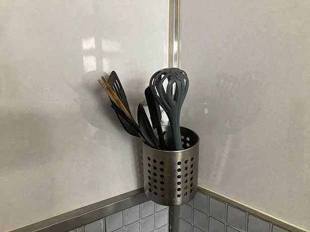 収納も、ターナーや菜箸などをまとめて入れている筒型スタンドに、柄の部分を差し込んじゃえばOK。