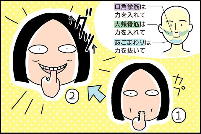 上の歯が8本見えるように、ほおと口角を上方に引き上げる。そのあとリラックスさせて。これを5~10回繰り返す×3セット行う。