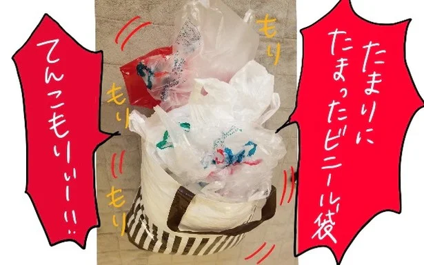 おかげで、たまりにたまったビニール袋が収集つかないほど溢れかえって、台所の一角を圧迫してるやないの!