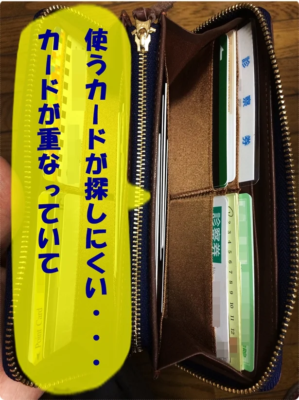 ところで、今まで私がカードを入れていた財布のカードポケットでは、カードの上部しか見えず、しかも入りきらないカードは重ねて入れていました。