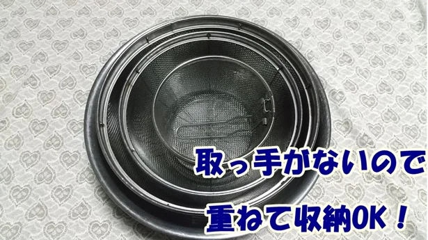 取っ手をザルの内側に折り込むことができるので、取っ手が引っ掛かることなくコンパクトに収納できます。