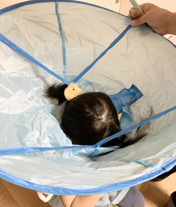 散髪用ケープは手のひらサイズですが、広げるとボワっと大きく広がります。